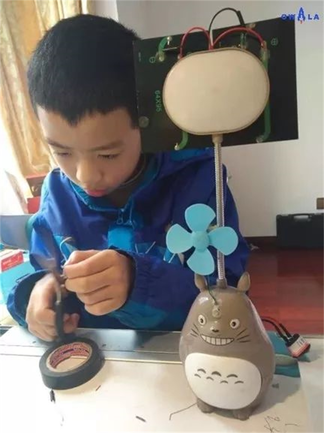 他在噢哇啦最近学的是电路主题,上个星期他在家里搞了一周,做了一个多功能的小台灯,这个台灯顶上面用了太阳能板,为它提供电源,下面又加了一个光控元件,利用光感,可以根据外界环境的明暗程度自动调节开关;另外他还在小龙猫的身体里面加了温感电阻,他说如果温度达到30度以上,这个风扇就会自己转起来。